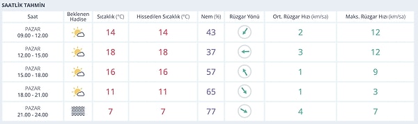 Öğle saatlerine doğru sıcaklık 18 dereceye kadar yükseliyor. 15.00-18.00 arasında sıcaklık 16 derece civarında kalacak ve nem oranı %57’ye yükselecek. Akşam saatlerine gelindiğinde sıcaklık 11 dereceye düşüyor. Gecenin ilerleyen saatlerinde ise hava hızla soğuyarak 7 dereceye kadar geriliyor.