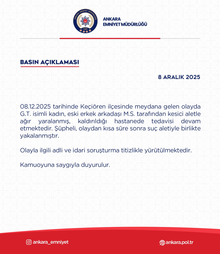 Ankara Emniyet Müdürlüğü, gelişmelerin kamuoyuna saygıyla duyurulduğunu açıkladı.