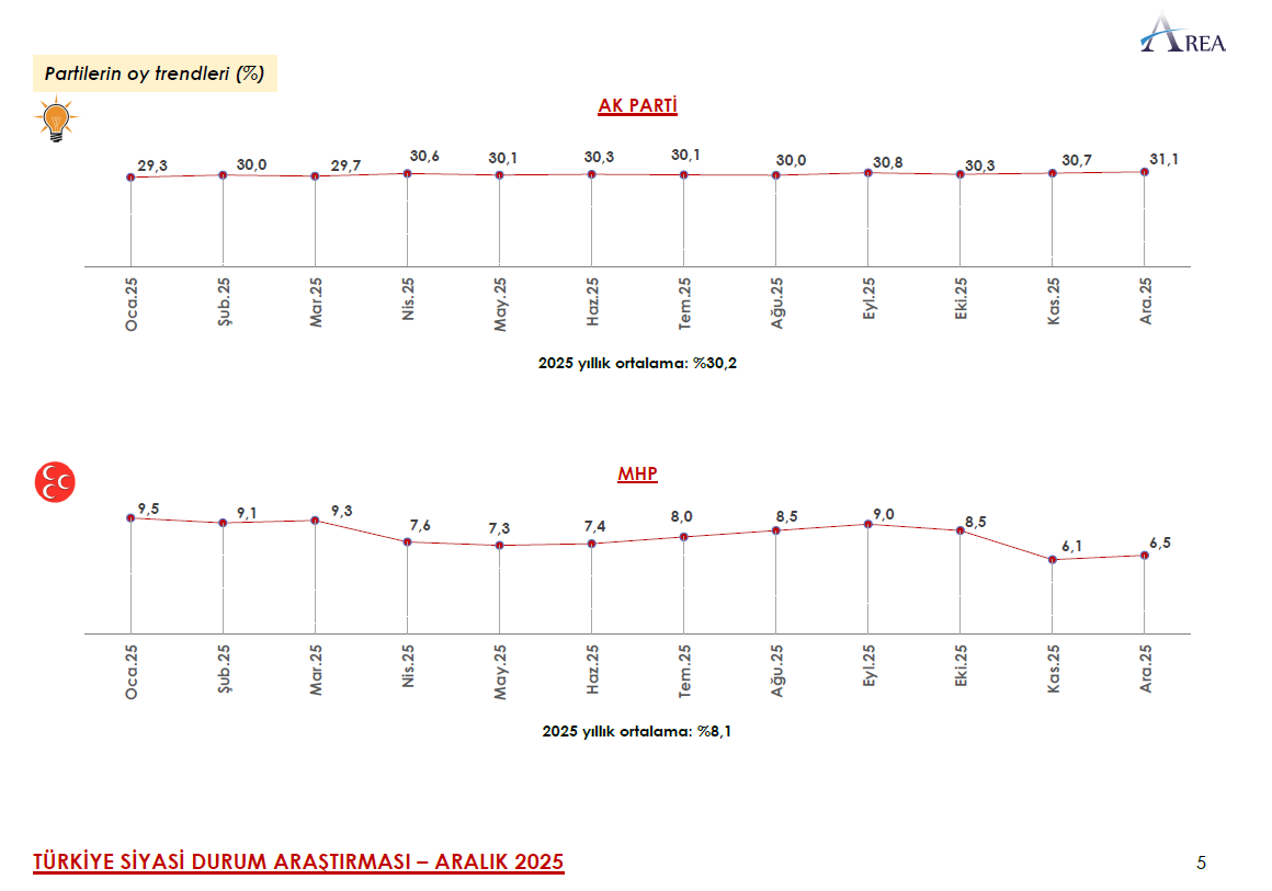 AKP 2025 yılının Ocak ayında yüzde 29,3 seviyesindeyken Aralık 2025 anketinde şimdiye kadarki en yüksek oy oranına yüzde 31,1 ile ulaştı. 2025 yılı ortalaması ise yüzde 30,2 oldu.