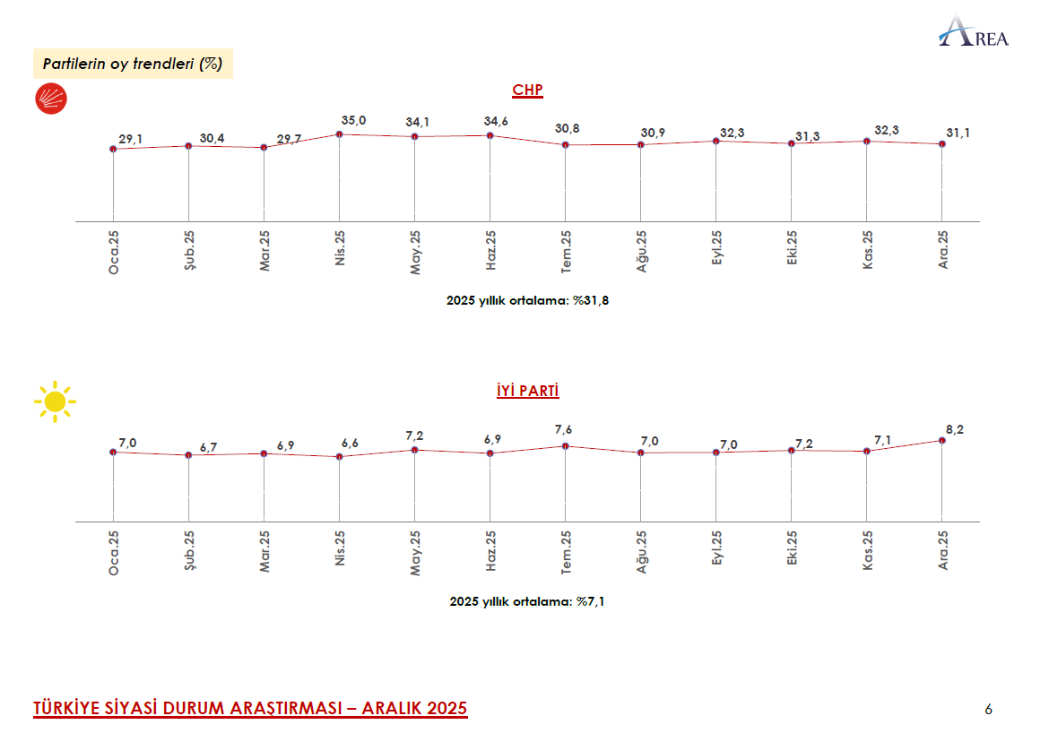 İYİ Parti 2025 yılına yüzde 7 seviyesinde başlarken Nisan ayında 6,6 ile en düşük seviyesine geriledi. 2025 Aralık anketinde ise yüzde 8,2 seviyesine yükseldi. 2025 yılı ortalaması ise yüzde 7,1 oldu.