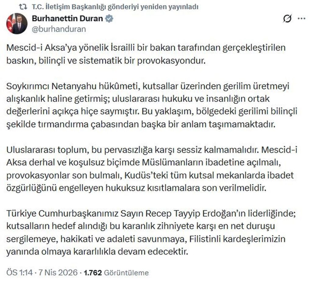 Eğitim İletişim Başkanı Duran: Mescid-i Aksa’ya yönelik baskın, bilinçli ve sistematik bir provokasyondur İLETİŞİM Başkanı Burhanettin Duran, “Mescid-i Aksa’ya yönelik İsrailli bir bakan tarafından gerçekleştirilen baskın, bilinçli ve sistematik bir provokasyondur” dedi. Hakan Kaplan 7 Nisan 2026 İLETİŞİM Başkanı Burhanettin Duran, “Mescid-i Aksa’ya yönelik İsrailli bir bakan tarafından gerçekleştirilen baskın, bilinçli ve sistematik bir provokasyondur” dedi. İletişim Başkanı Duran, sanal medya hesabından yaptığı açıklamada, “Mescid-i Aksa’ya yönelik İsrailli bir bakan tarafından gerçekleştirilen baskın, bilinçli ve sistematik bir provokasyondur. Soykırımcı Netanyahu hükümeti, kutsallar üzerinden gerilim üretmeyi alışkanlık haline getirmiş; uluslararası hukuku ve insanlığın ortak değerlerini açıkça hiçe saymıştır. Bu yaklaşım, bölgedeki gerilimi bilinçli şekilde tırmandırma çabasından başka bir anlam taşımamaktadır. Uluslararası toplum, bu pervasızlığa karşı sessiz kalmamalıdır. Mescid-i Aksa derhal ve koşulsuz biçimde Müslümanların ibadetine açılmalı, provokasyonlar son bulmalı, Kudüs’teki tüm kutsal mekanlarda ibadet özgürlüğünü engelleyen hukuksuz kısıtlamalara son verilmelidir. Türkiye Cumhurbaşkanımız Sayın Recep Tayyip Erdoğan’ın liderliğinde; kutsalların hedef alındığı bu karanlık zihniyete karşı en net duruşu sergilemeye, hakikati ve adaleti savunmaya, Filistinli kardeşlerimizin yanında olmaya kararlılıkla devam edecektir” ifadelerini kullandı. Related Stories Kapısının önündeki ağacı budadı, bir daire parası ceza yedi Eğitim Kapısının önündeki ağacı budadı, bir daire parası ceza yedi 7 Nisan 2026 Fransa’da Tren Kazası: 1 Ölü, 27 Yaralı Eğitim Fransa’da Tren Kazası: 1 Ölü, 27 Yaralı 7 Nisan 2026 KKTC’de hayat pahalılığı protestosu! Eylemciler Meclis’e girdi, polis biber gazı kullandı Eğitim KKTC’de hayat pahalılığı protestosu! Eylemciler Meclis’e girdi, polis biber gazı kullandı 7 Nisan 2026