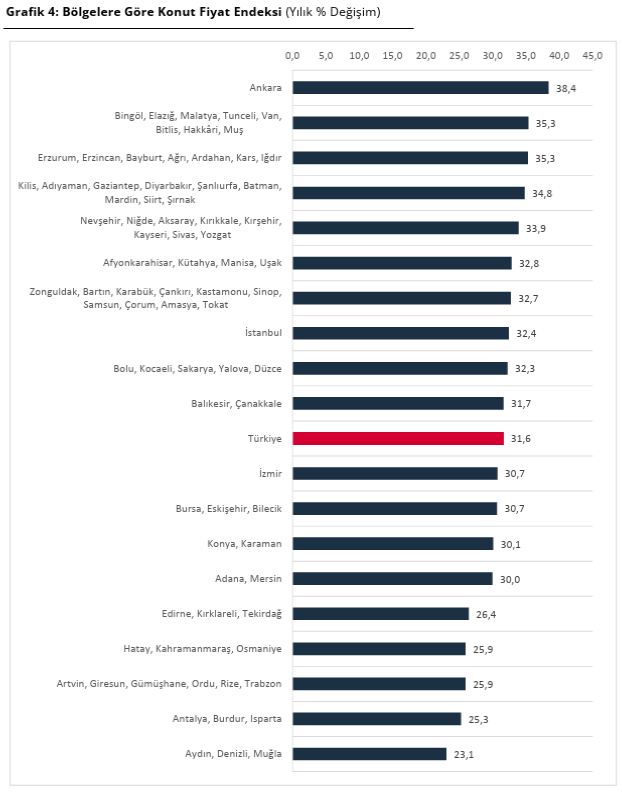 İstatistiki Bölge Birimleri Sınıflamasına göre bölgelerin yıllık konut fiyat endeksi değişimleri incelendiğinde, Ekim 2025 döneminde en yüksek yıllık artış yüzde 38,4 ile Ankara bölgesinde, en düşük yıllık artış ise yüzde 23,1 ile Aydın, Denizli, Muğla bölgesinde gözlendi.