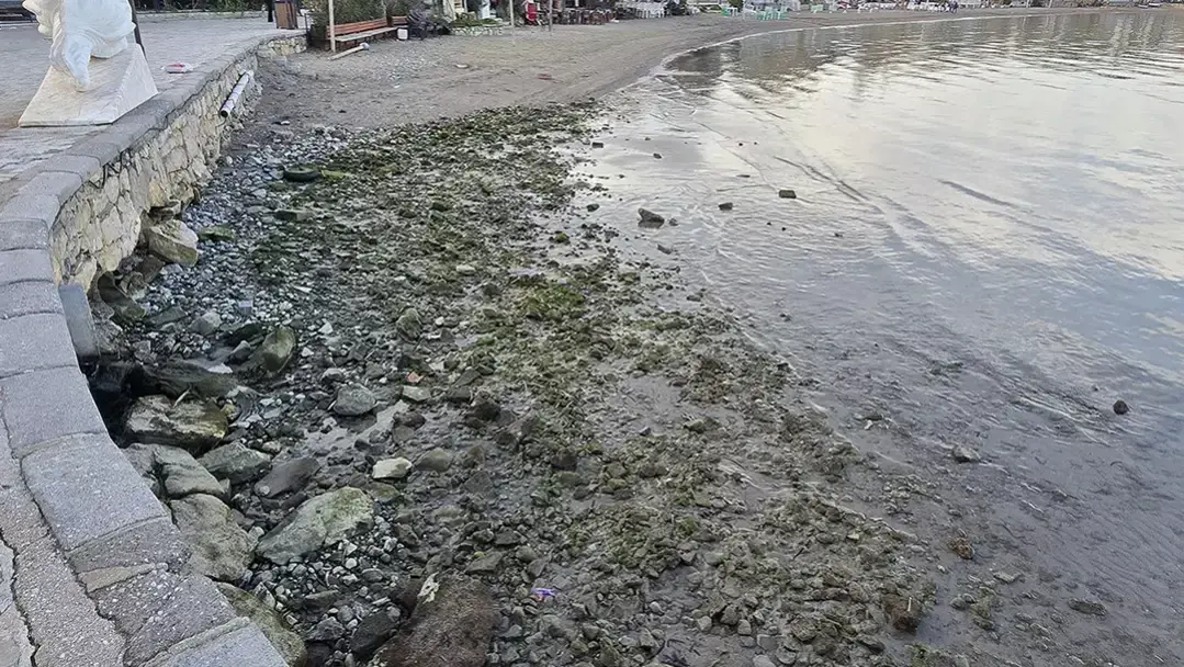 Ege Denizi kıyısındaki Datça Kumluk Plajı’nda da benzer bir manzara oluştu. Deniz tabanındaki taşlar ve yosunlar görünür hale geldi.