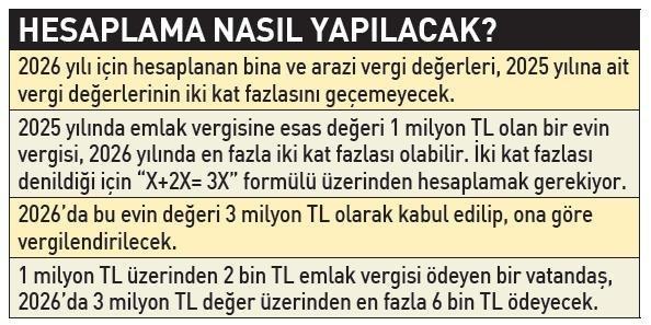 Bir evin 2025 yılı emlak vergisine esas değeri 1 milyon TL ise, 2025 yılında takdir komisyonu kararıyla yapılan fahiş artışla bu 5 milyon TL olarak belirlenmişse, 2026’da bu evin değeri 3 milyon TL olarak kabul edilip, ona göre vergilendirilecek.